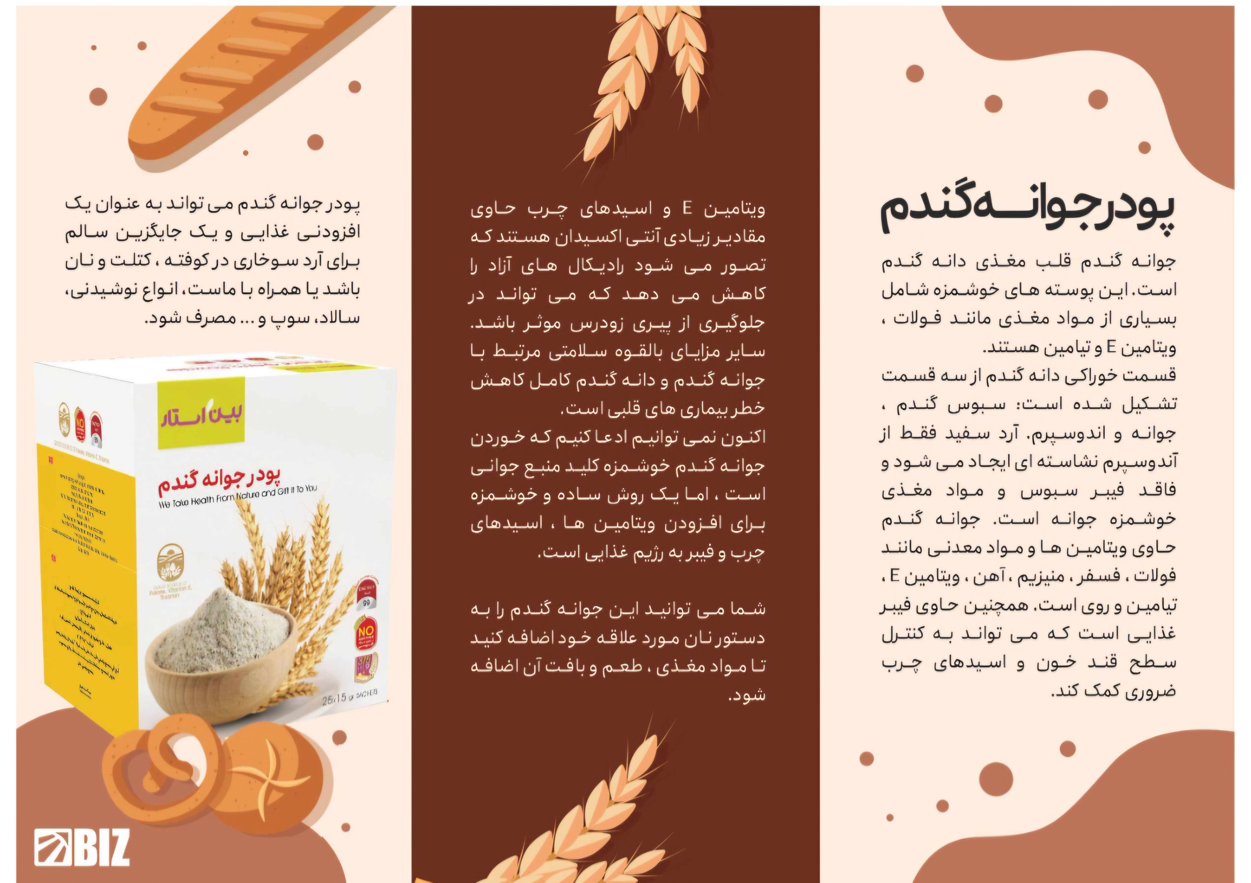 نحوه مصرف:پودر جوانه گندم می تواند به عنوان یک افزودنی غذایی و یک جایگزین سالم برای آرد سوخاری در کوفته ، کتلت و نان استفاده شود. یا همراه با ماست، انواع نوشیدنی، سالاد، نسکافه جهت جوانسازی پوست استفاده شود.